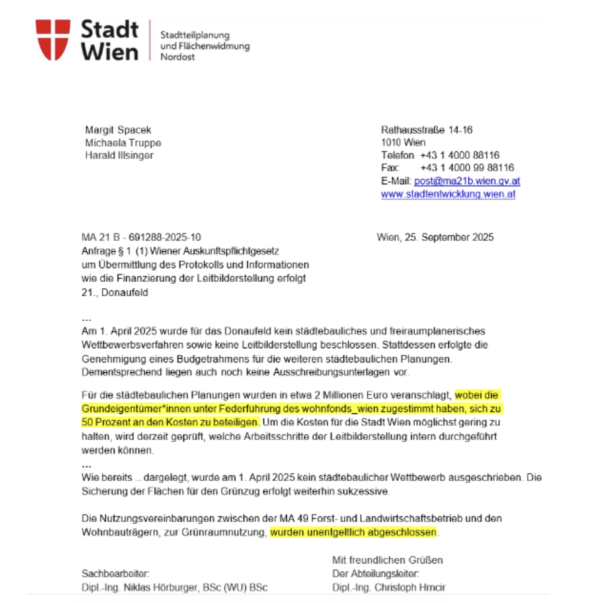 Die Stadt Wien wendet diese Maxime nicht mehr an: „Donaufeld… Für die städtebaulichen Planungen wurden in etwa 2 Millionen Euro veranschlagt, wobei die Grundeigentümer*innen unter Federführung des wohnfonds_wien zugestimmt haben, sich zu 50 Prozent an den Kosten zu beteiligen.“ Auskunft MA 21b vom 25. September, siehe Abbildung 1