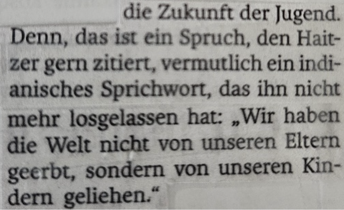 „Wir haben die Welt nicht von unseren Eltern geerbt, sondern von unseren Kindern geliehen.“ Andreas Haitzer, Bürgermeister von Schwarzach und Nationalrat für die SPÖ. Salzburger Nachrichten, 18. August 2025