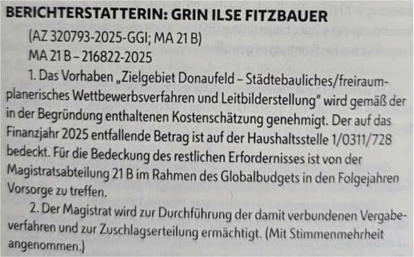„Am 1. April 2025 wurde für das Donaufeld kein städtebauliches und freiraumplanerisches Wettbewerbsverfahren sowie keine Leitbilderstellung beschlossen.“