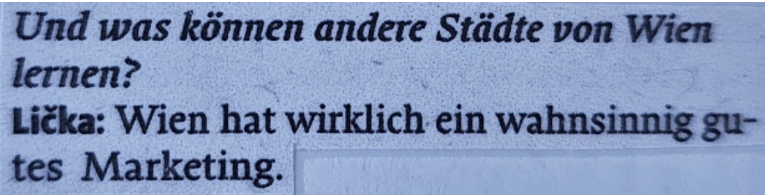 „Wien hat wirklich ein wahnsinnig gutes Marketing“ Landschaftsarchitektin Lilli Licka im Falter-Interview 33/25, Seite 45. Anders formuliert: Die Stadtregierung versucht, den Wiener:innen möglichst viel „hinein zu drücken“.